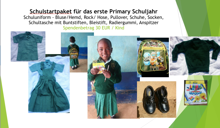 8 Kinder, die von Januar an auf die Primary School gehen, werden mit einer Schuluniform, Schultasche, Stiften, Radiergummi und Anspitzer ausgestattet und durch die Spenden kann ihnen ein guter Start in die Schulzeit geboten werden.